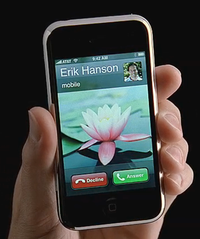 Here’s a screen-grab from one of the iPhone ads, and it exemplifies why I don’t think Apple got it right. Here in Western cultures we read left-right. So WHY would you put the hang up button on the left – when a call comes in? That’s the first button your eye sees, and EVERY OTHER PHONE OUT THERE puts the answer and disconnect buttons on the left and right, respectively.