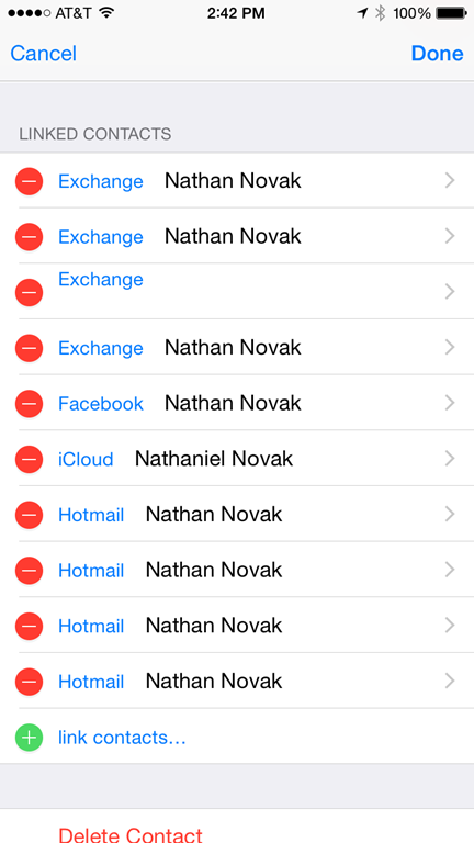 The result of all this isn’t fatal, but it’s a gigantic PAIN IN THE ASS! I had a TON of duplicate contacts that showed up on my iPhone when I first set up my accounts. Thankfully the iPhone lets you merge multiple contacts together so the end result is that I had to spend some quality time with my address book merging dupes, as shown to the right. Note, I only have 1 account each for Exchange, Facebook, iCloud, and Hotmail. Don’t get me wrong – this isn’t an issue caused by iOS; I have to lay blame for this squarely on Microsoft’s shoulders (including myself since I was on the feature team that helped create this mess). In fact, this is why having Microsofties dogfood experiences on other platforms is a GOOD thing! If I had been on an iPhone 2 years ago I could have helped prioritize getting this fixed; instead we didn’t really even know this was a problem at the time.