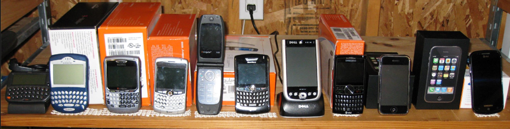 Hi, my name is Nathan and I’m a mobile tech addict. From L to R that’s a RIM 950, BlackBerry 6210, BlackBerry 8700c, Cingular 3125 (aka HTC Startrek running WinMo 5.0), BlackBerry 8820, Dell Axim X51v (Windows PDA – remember those?), Samsung Blackjack II (WinMo 6.0), iPhone, iPhone 3G, and Samsung Focus. Missing are at least 4 BlackBerry models that I upgraded from (and by upgrade I mean I got a new model and someone else at my company got my 4 month old phone), and both my more recent Lumia 900 and Lumia 920 … and of course my current iPhone 6.